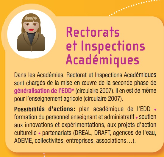 Les Académies et leurs responsables Education au développement durable sont des interlocuteurs privilégiés pour former les enseignants et les accompagner dans les démarches Agenda 21. C’est le cas pour les Académies de Caen, Dijon, Lille, Poitiers, Rouen, Strasbourg…